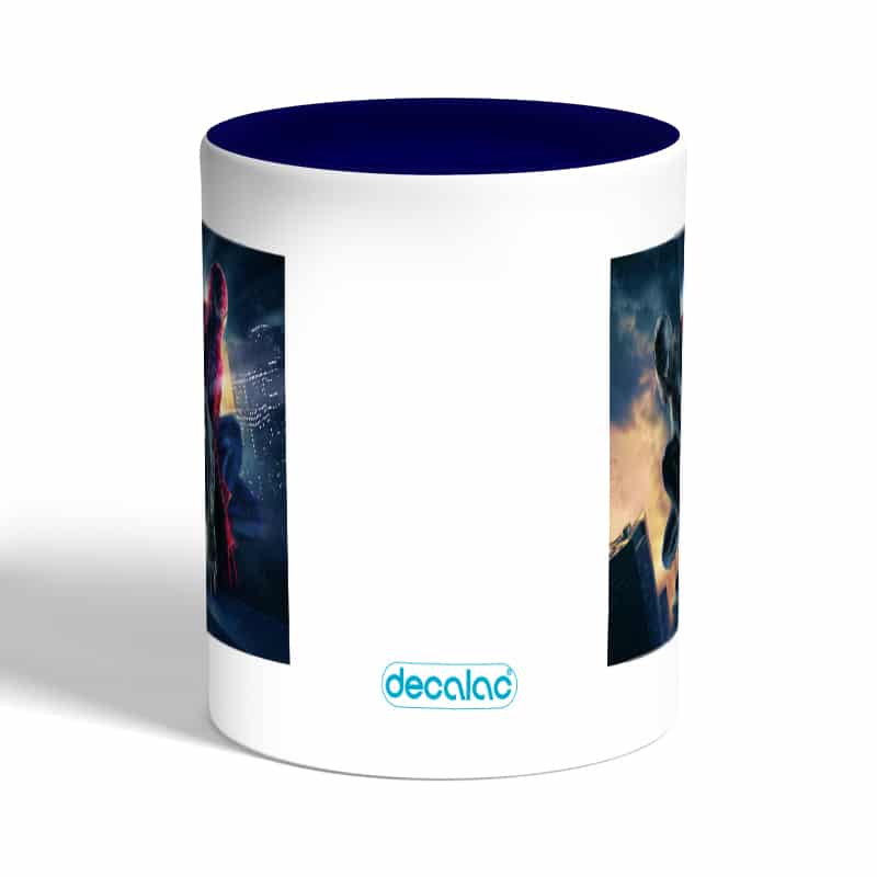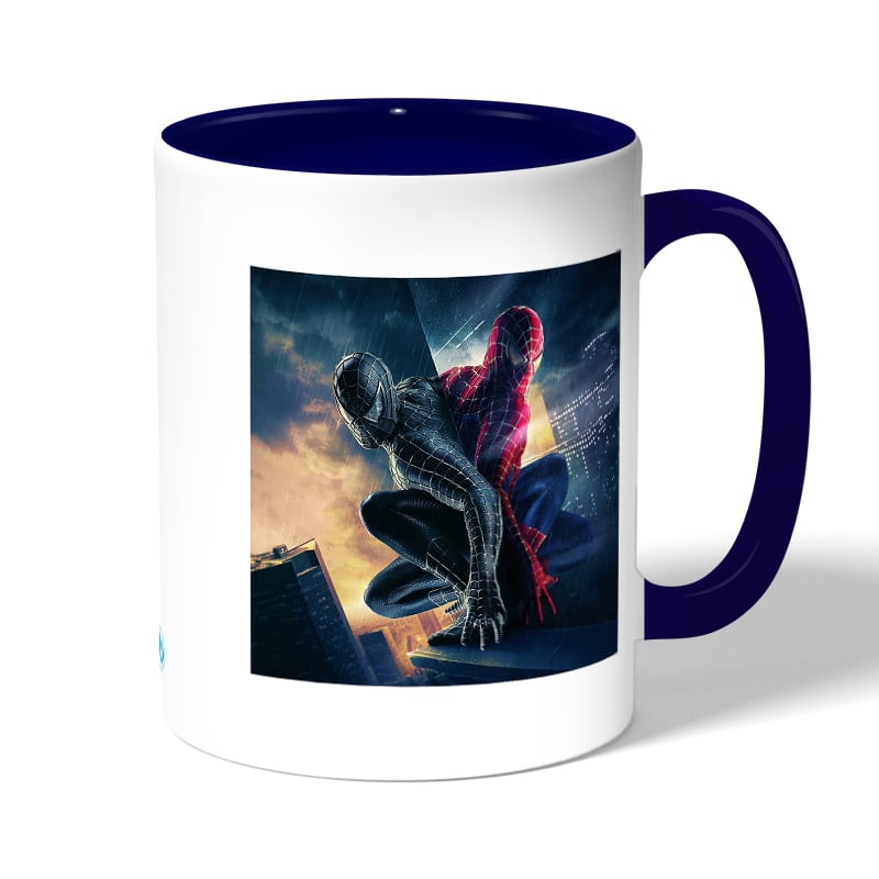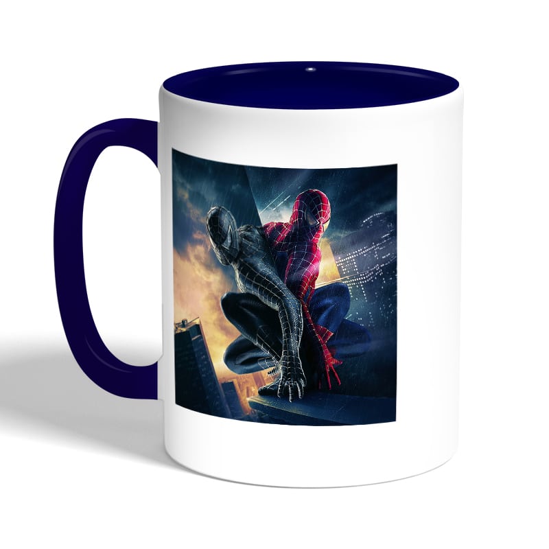 كوب قهوة بمقبض ازرق داكن بتصميم الشر يسيطرعلى سبايدر مان