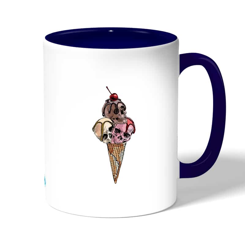 كوب قهوة بمقبض ازرق داكن بتصميم مثلجات الجماجم