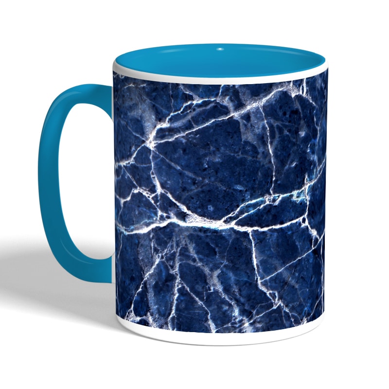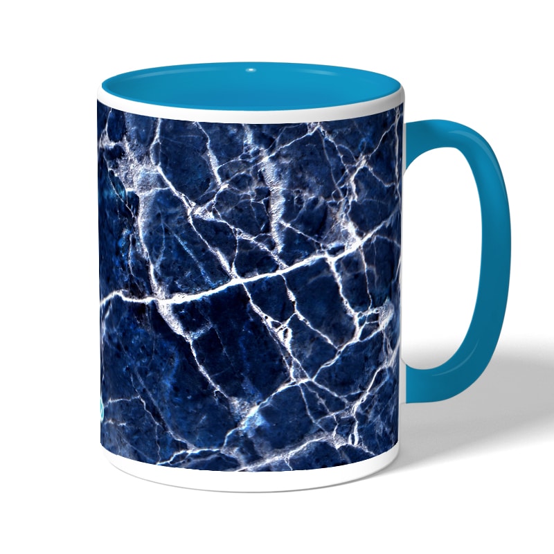 كوب قهوة بمقبض ازرق فاتح بتصميم أزرق وأبيض