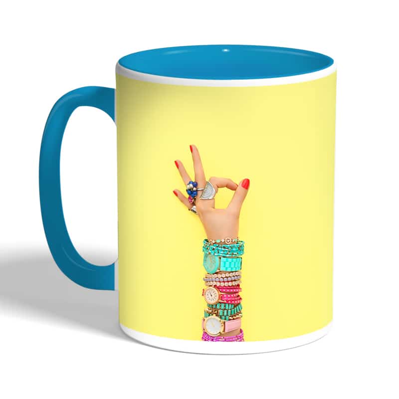 كوب قهوة بمقبض ازرق فاتح بتصميم اكسسوارات يد امرأة مصنوع من السيراميك ذات الجودة العالية المزينة بتصاميم ورسوم ابداعية تعبّر عن تميزك واسلوبك الخاص، اذا كنت تبحث عن هدية مميزة، غير تقليدية لأحبائك وأصدقائك، أو أن تضيف لمسة جمالية الى كوب القهوة الصباحي، أنت إذن في المكان الصحيح.