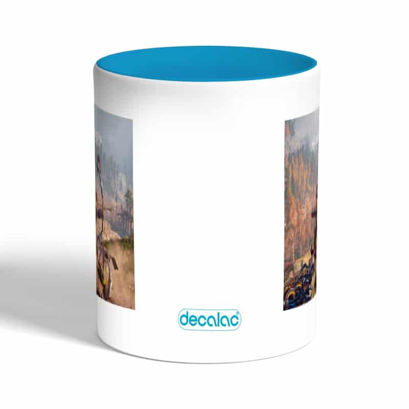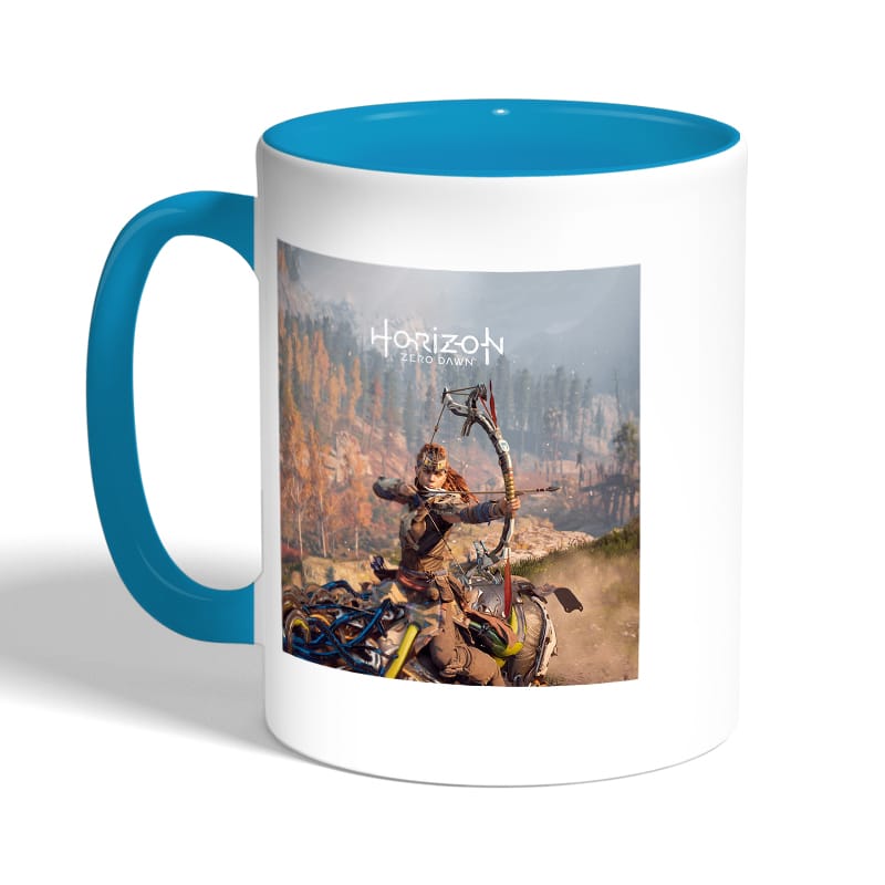 كوب قهوة بمقبض ازرق فاتح بتصميم رماية أسهم إلوي هورايزن زيرو داون
