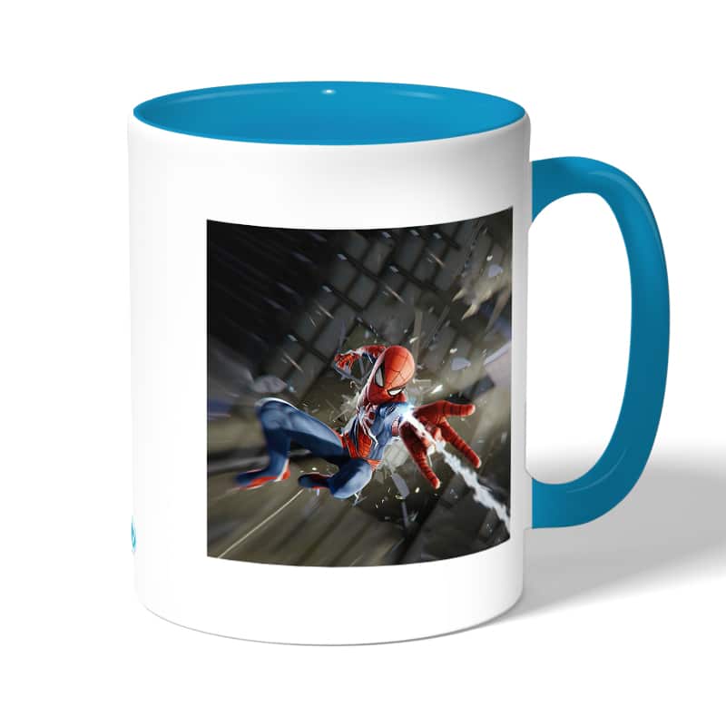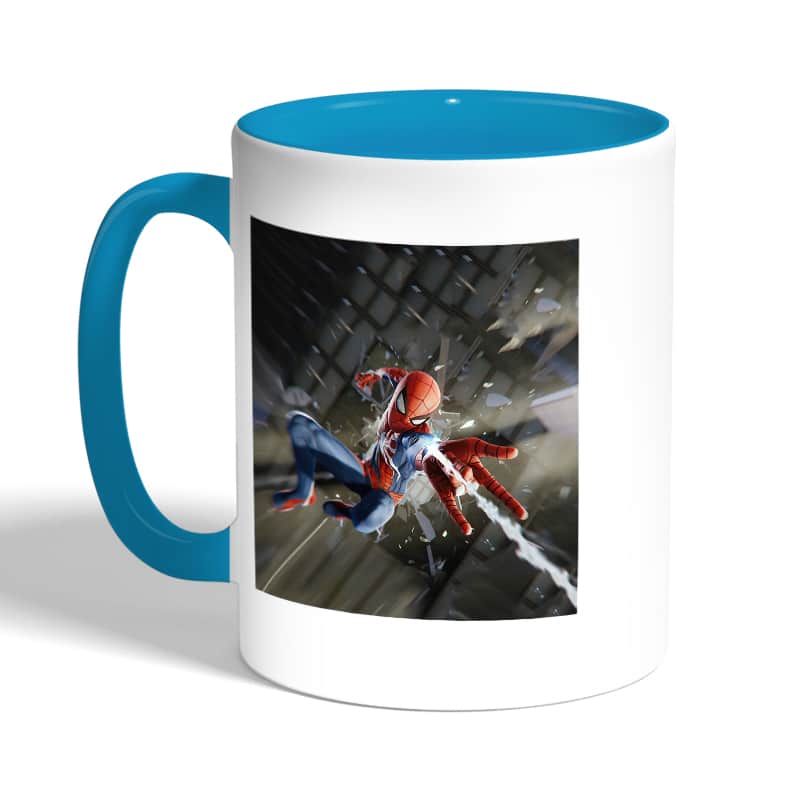 كوب قهوة بمقبض ازرق فاتح بتصميم قوة سبيدر مان