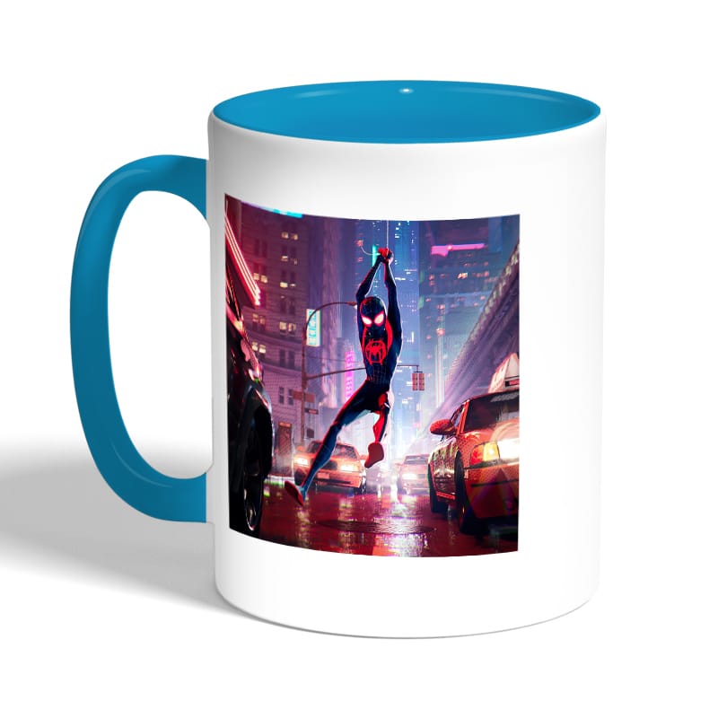 كوب قهوة بمقبض ازرق فاتح بتصميم مايلز مورالز سبايدر مان