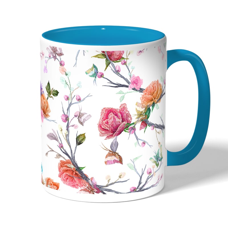 كوب قهوة بمقبض ازرق فاتح بتصميم مورد مصنوع من السيراميك ذات الجودة العالية المزينة بتصاميم ورسوم ابداعية تعبّر عن تميزك واسلوبك الخاص، اذا كنت تبحث عن هدية مميزة، غير تقليدية لأحبائك وأصدقائك، أو أن تضيف لمسة جمالية الى كوب القهوة الصباحي، أنت إذن في المكان الصحيح.