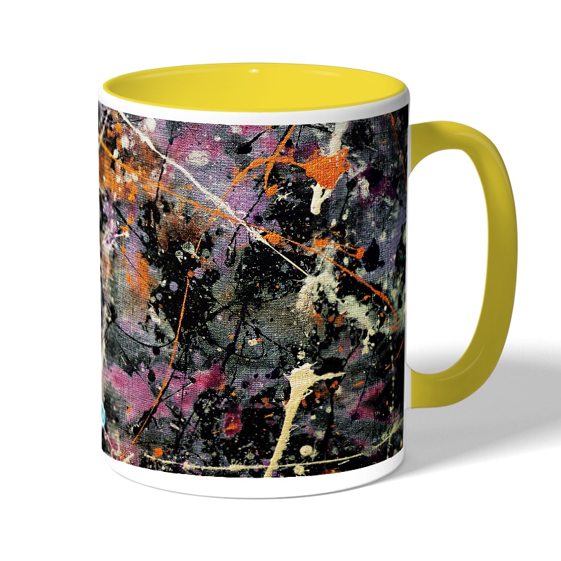 كوب قهوة بمقبض اصفر بتصميم فن تجريدي