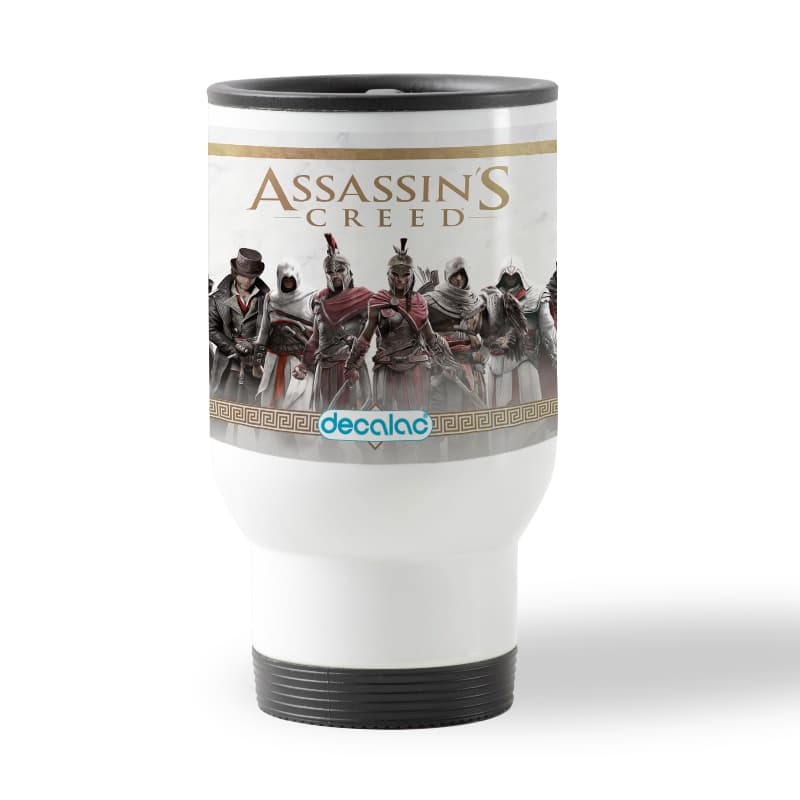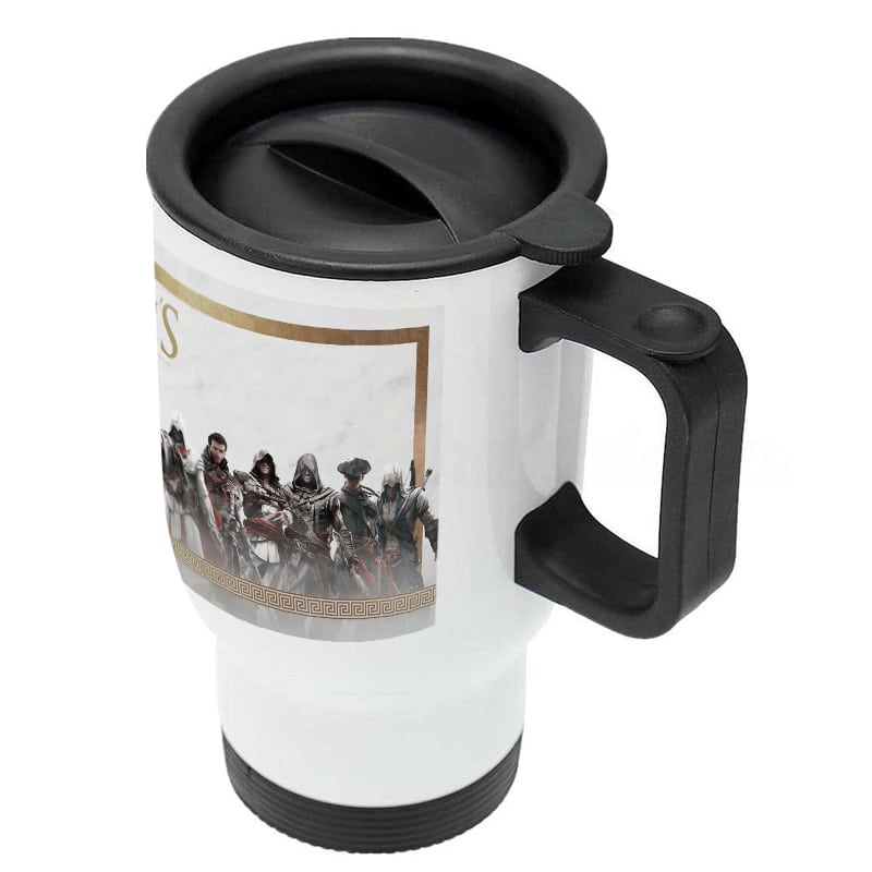 كوب قهوة للسيارة لون ابيض بتصميم أساسنز كريد جميع الشخصيات من ديكالك، لمسة إبداعية لأكواب القهوة المصنوعة الفولاذ المقاوم للصدأ (ستينليس ستيل)، التي تمت معالجتها لنضمن لكم جودة المنتج وكذلك ثبات الألوان عند غسلها بحيث لا تتعرض للتلاشى.