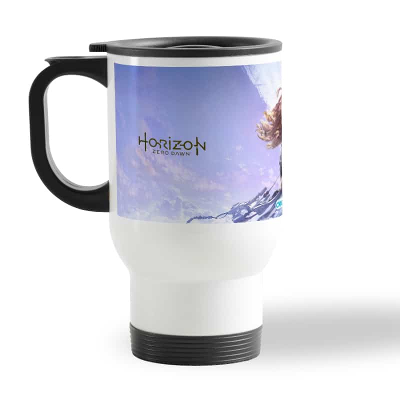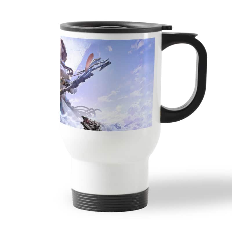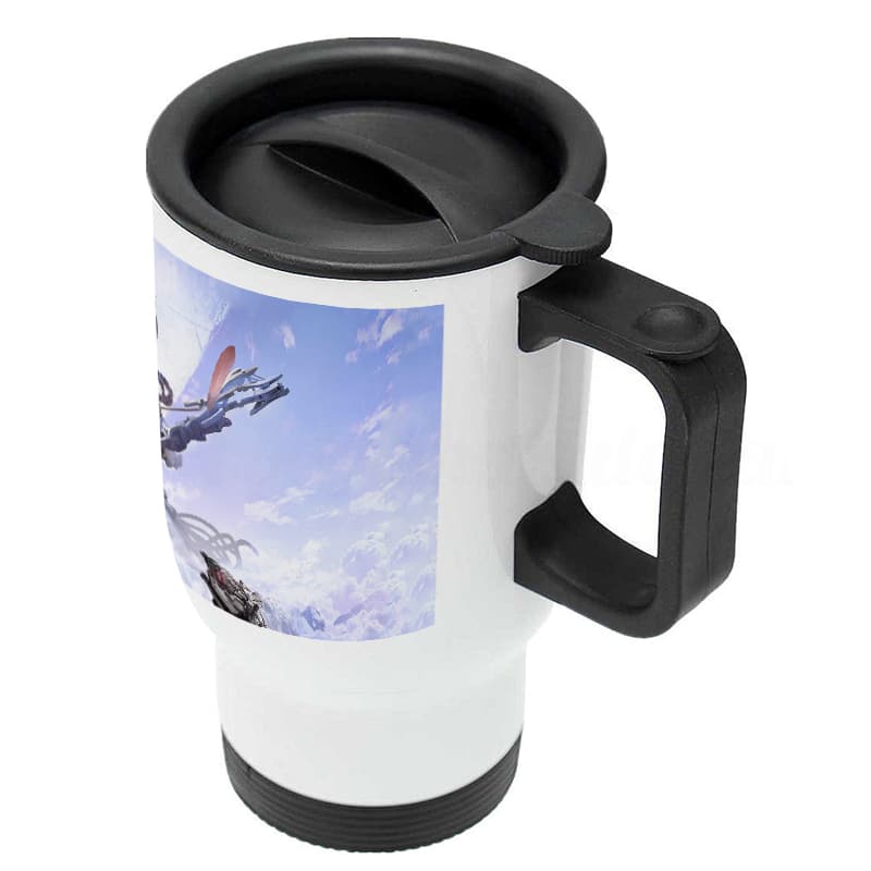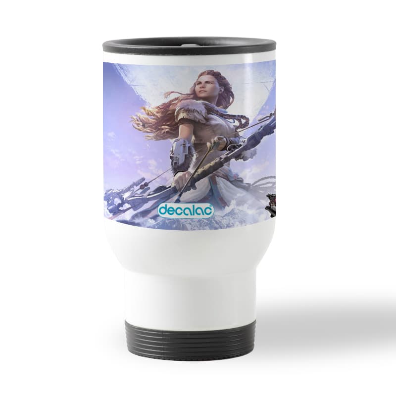 كوب قهوة للسيارة لون ابيض بتصميم الصيّادة إلوي هورايزن زيرو داون من ديكالك، لمسة إبداعية لأكواب القهوة المصنوعة الفولاذ المقاوم للصدأ (ستينليس ستيل)، التي تمت معالجتها لنضمن لكم جودة المنتج وكذلك ثبات الألوان عند غسلها بحيث لا تتعرض للتلاشى.