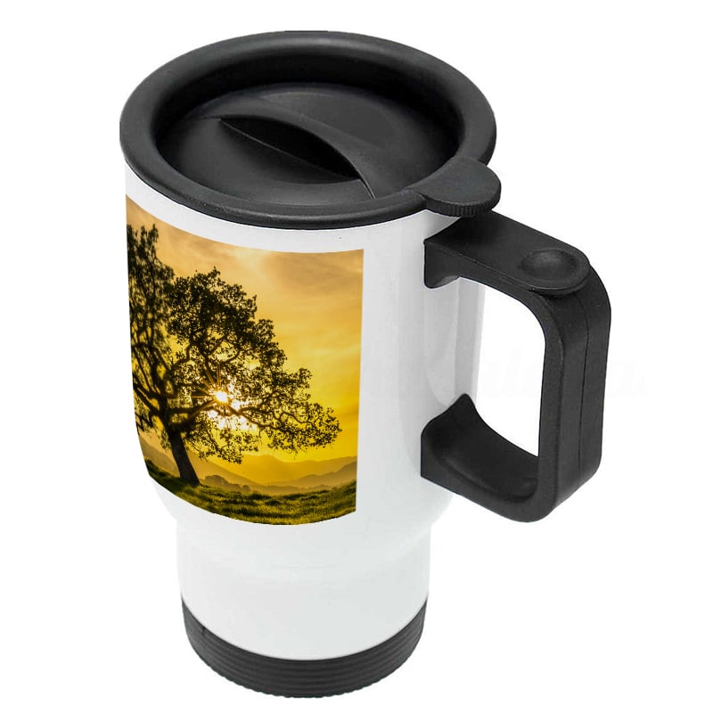 كوب قهوة للسيارة لون ابيض بتصميم شجره الغروب من ديكالك، لمسة إبداعية لأكواب القهوة المصنوعة الفولاذ المقاوم للصدأ (ستينليس ستيل)، التي تمت معالجتها لنضمن لكم جودة المنتج وكذلك ثبات الألوان عند غسلها بحيث لا تتعرض للتلاشى.
