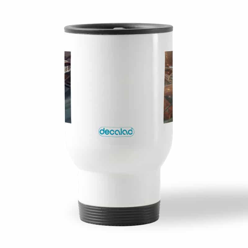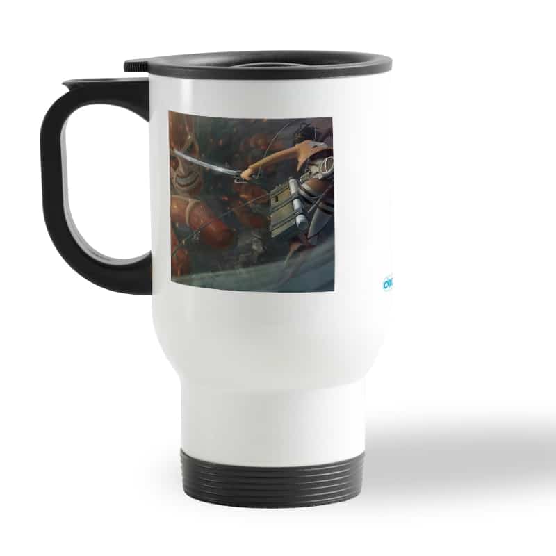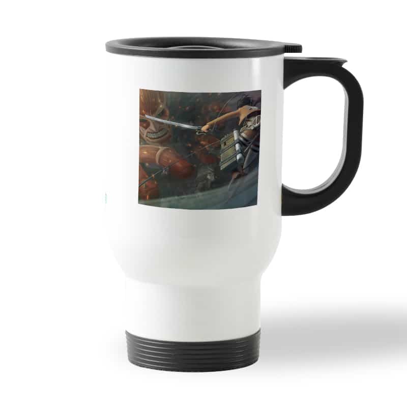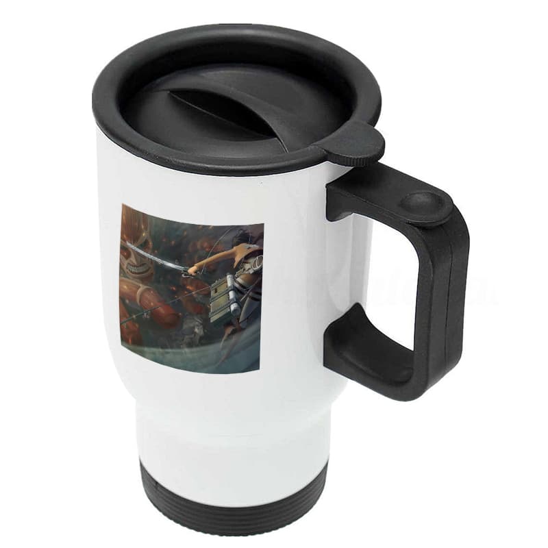 كوب قهوة للسيارة لون ابيض بتصميم قتال مع العملاق الضخم هجوم العمالقة من ديكالك، لمسة إبداعية لأكواب القهوة المصنوعة الفولاذ المقاوم للصدأ (ستينليس ستيل)، التي تمت معالجتها لنضمن لكم جودة المنتج وكذلك ثبات الألوان عند غسلها بحيث لا تتعرض للتلاشى.