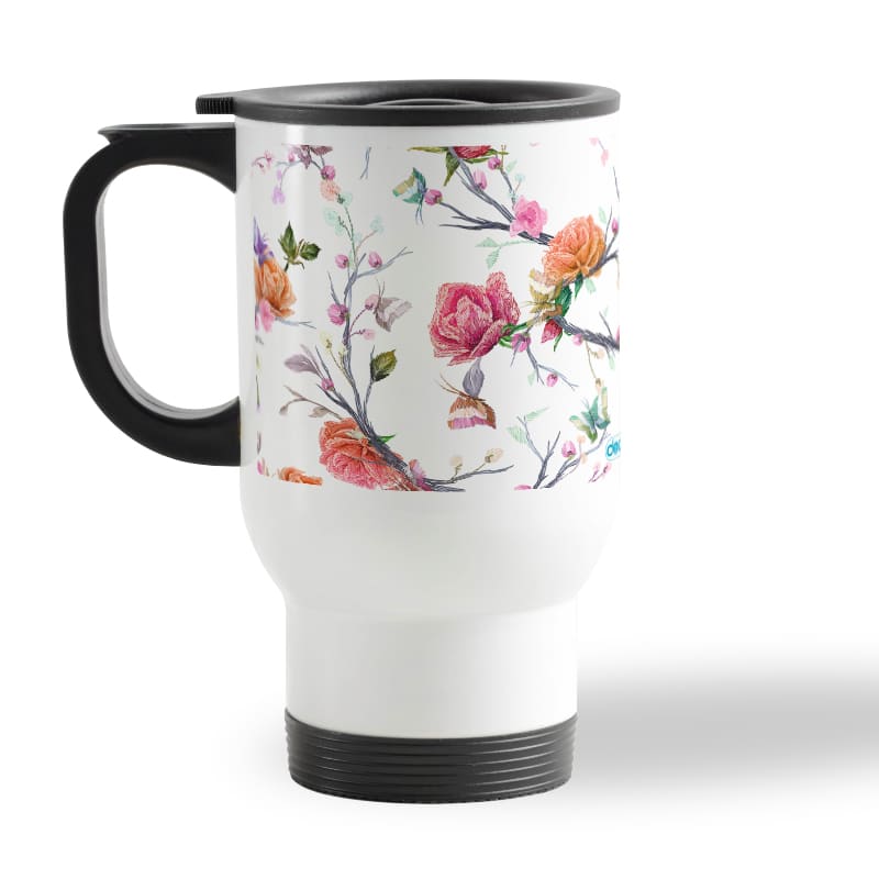 كوب قهوة للسيارة لون ابيض بتصميم مورد من ديكالك، لمسة إبداعية لأكواب القهوة المصنوعة الفولاذ المقاوم للصدأ (ستينليس ستيل)، التي تمت معالجتها لنضمن لكم جودة المنتج وكذلك ثبات الألوان عند غسلها بحيث لا تتعرض للتلاشى.