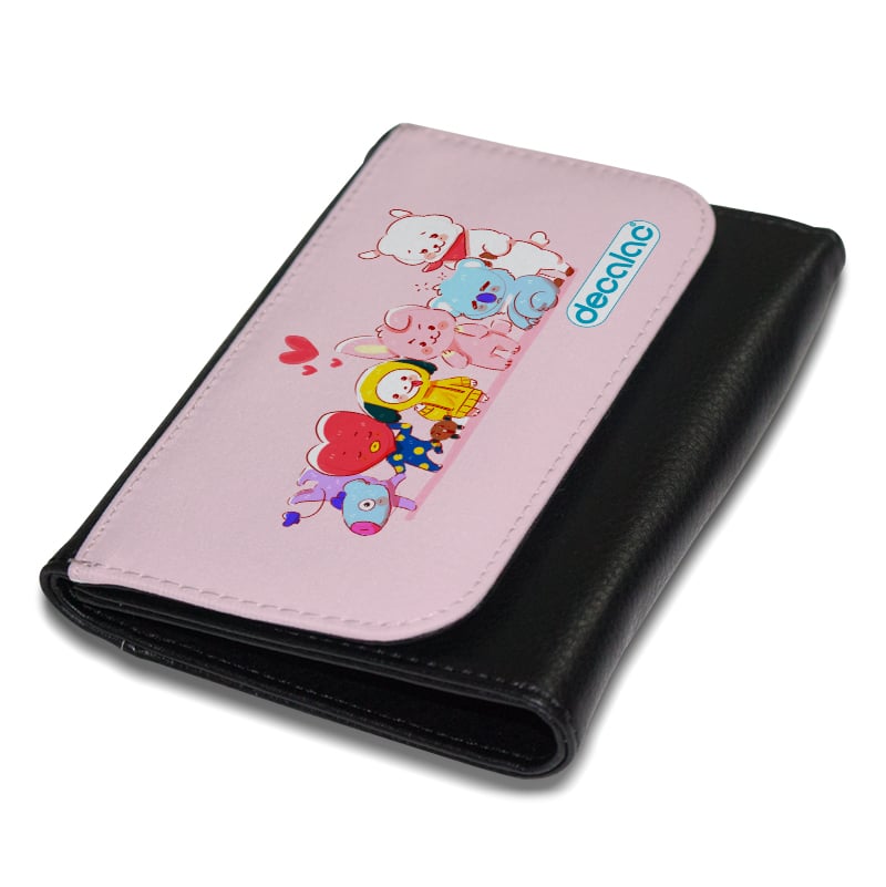 محفظة جلد بتصميم شخصيات BT21 المحبوبة من ديكالك، محفظة تتميز بمساحة مناسبة لحفظ متطلباتك الشخصية، ولحفظ الكروت والبطاقات الخاصة بك، مصنوعة من الجلد والقماش المعالج لنضمن لكم جودة المنتج وثبات الألوان كذلك عند استخدامه بحيث لا يتعرض للتلاشى.