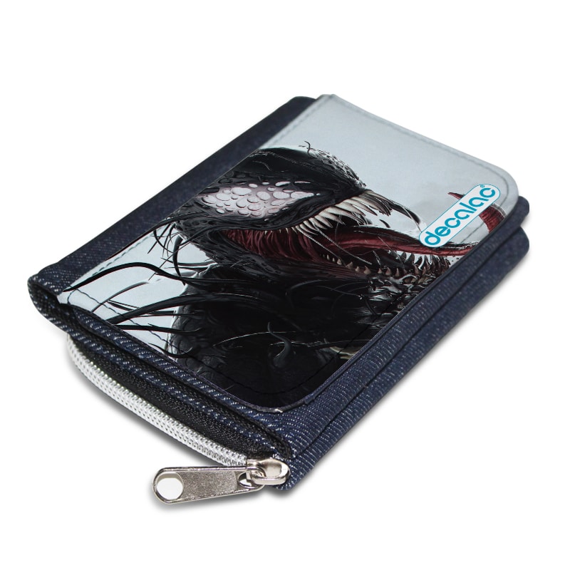 محفظة جينز بتصميم الوحش فينوم من ديكالك، محفظة جينز تتميز بمساحة مناسبة لحفظ متطلباتك الشخصية، ولحفظ الكروت والبطاقات الخاصة بك، مصنوعة من الجينز والقماش المعالج لنضمن لكم جودة المنتج وكذلك ثبات الألوان عند استخدامه بحيث لا يتعرض للتلاشى.
