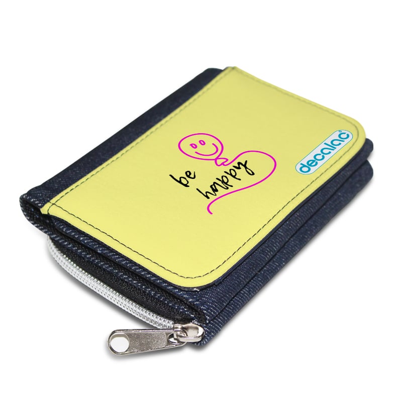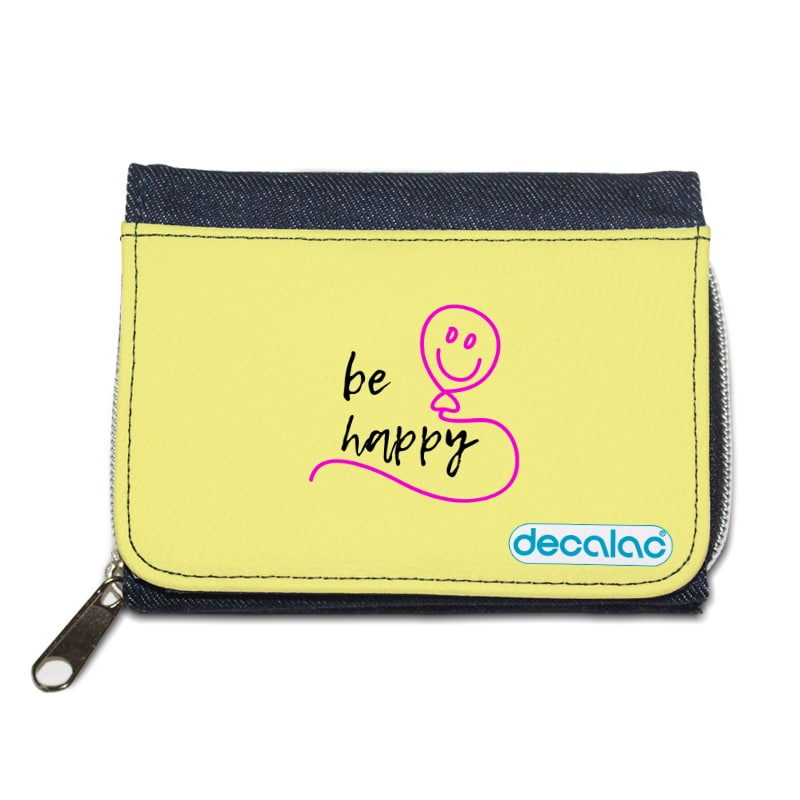 محفظة جينز بتصميم كن سعيد من ديكالك، محفظة جينز تتميز بمساحة مناسبة لحفظ متطلباتك الشخصية، ولحفظ الكروت والبطاقات الخاصة بك، مصنوعة من الجينز والقماش المعالج لنضمن لكم جودة المنتج وكذلك ثبات الألوان عند استخدامه بحيث لا يتعرض للتلاشى.