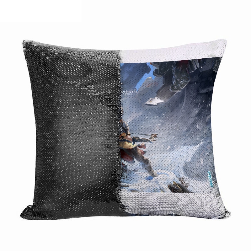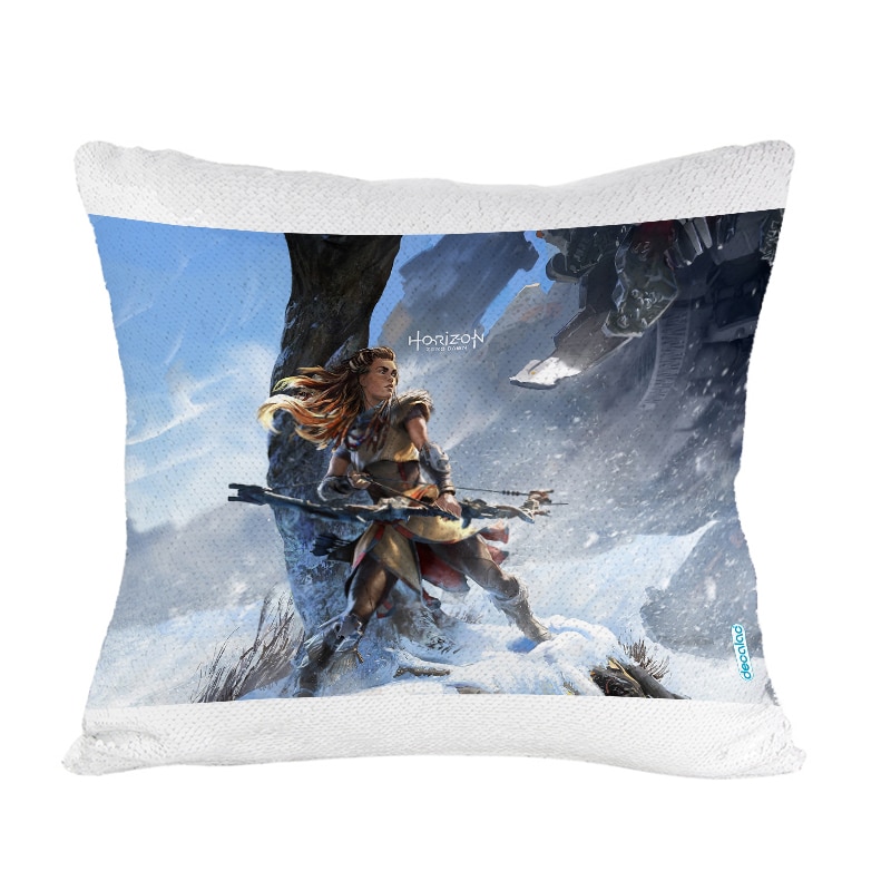 مخدة سحرية مع الحشوة لون اسود بتصميم إلوي هوريزن زيرو دون من ديكالك، مخدة سحرية بلمسات رائعة وتصاميم أنيقة، مزسنة بالترتر لإضافة لمسة رائعة لمنزلك. وقد تمت معالجة القماش لنضمن لكم جودة المنتج وكذلك ثبات الألوان عند استخدامها او غسيلها بحيث لا تتلاشى.